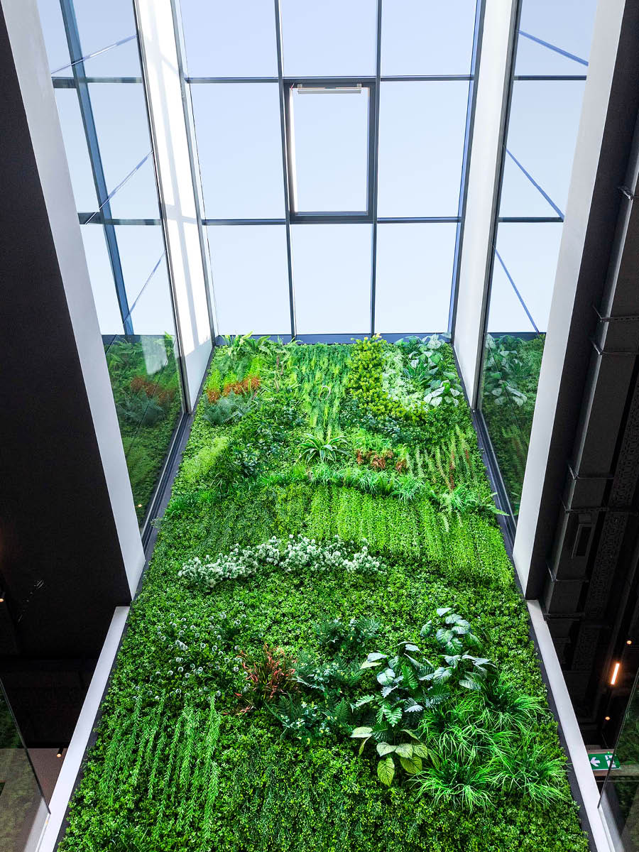 Ein architektonisches Highlight ist der offene Luftraum, der bis ins zweite Obergeschoss reicht, wo sich der Bereich der Geschäftsführung sowie eine Dachterrasse mit flexiblen Verschattungsmöglichkeiten befindet. Eine begrünte Wand unterstreicht den nachhaltigen Ansatz des Designs.